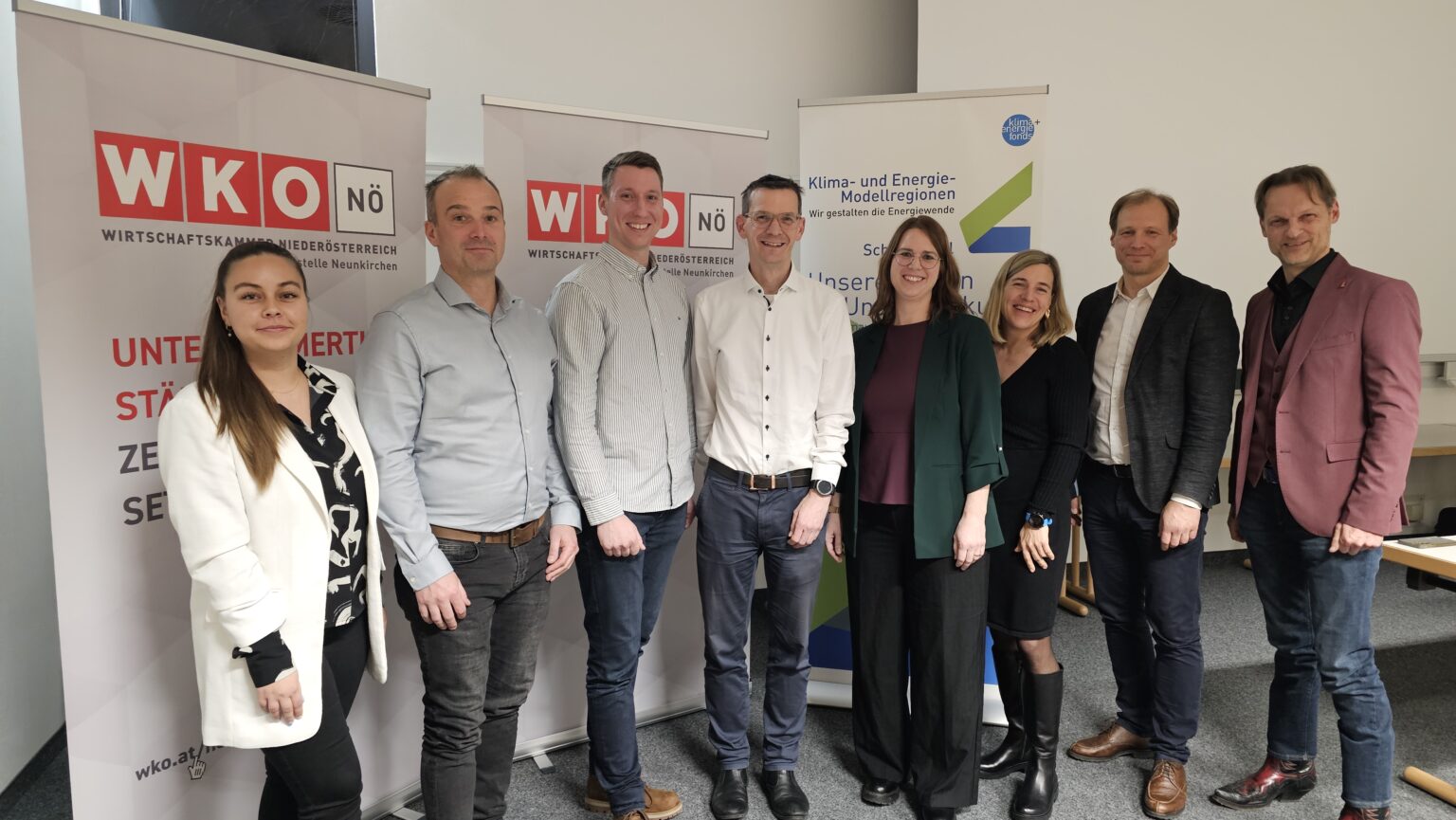 Personen (ohne Titel) am Foto, v.l.n.r.: Christina Schalko (im-plan-tat), Oliver Marek (Obmann-Stv./Kassier EEG Neunkirchen), Peter Buchleitner (Obmann EEG Neunkirchen), Peter Teix (Bürgermeister Stadtgemeinde Neunkirchen), Clara Urban (EZN), Katharina Fuchs (KEM), Bernhard Dissauer-Stanka (Bezirksstellenleiter WK NÖ – Bezirksstelle Neunkirchen), Matthias Zawichowski (im-plan-tat)